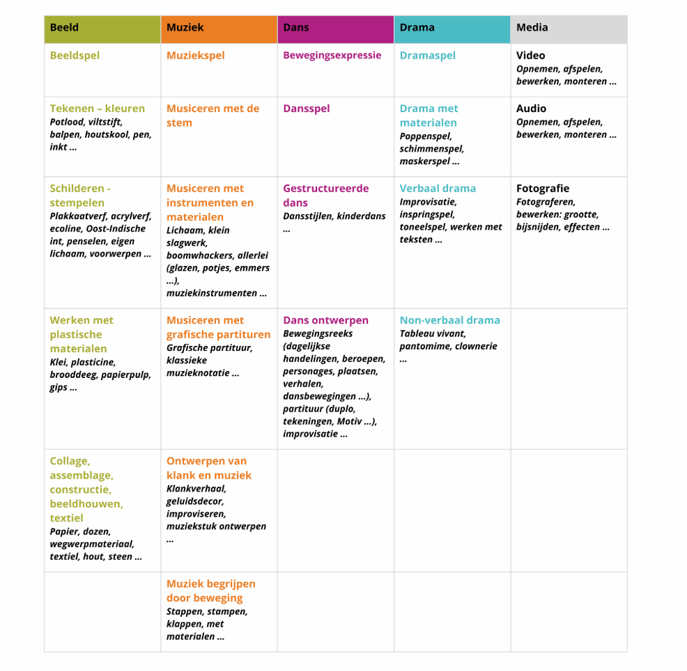 In het leergebied muzische vorming bied je doelbewust krachtige en gevarieerde activiteiten aan waarin leerlingen kunnen ervaren hoe mensen gebruik maken van beeld, muziek, drama, dans en media. Je leert de leerlingen om onbevangen uitdrukking te geven aan: