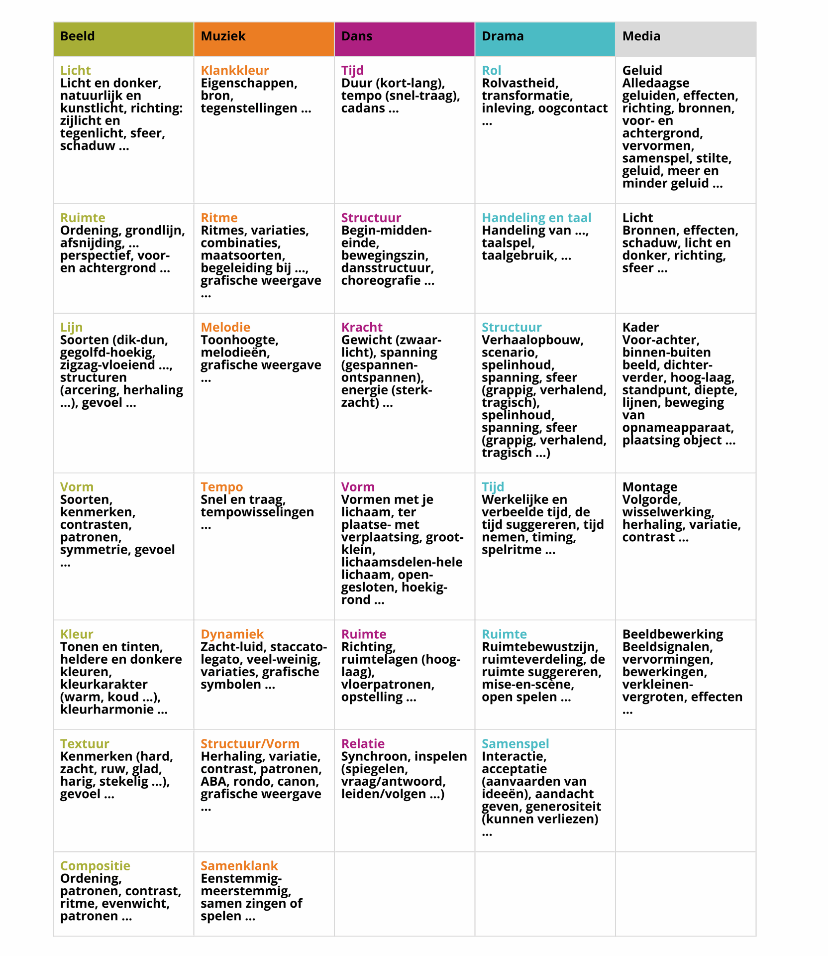 Hieronder zie je een schematisch overzicht van de bouwstenen per domein van muzische vorming. Wil je meer te weten komen over het waar/wat/waarom van de bouwstenen dan kan dat via dit filmpje.