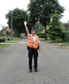 Je rijdt met je fiets op de weg. Je ziet deze agent voor je staan.