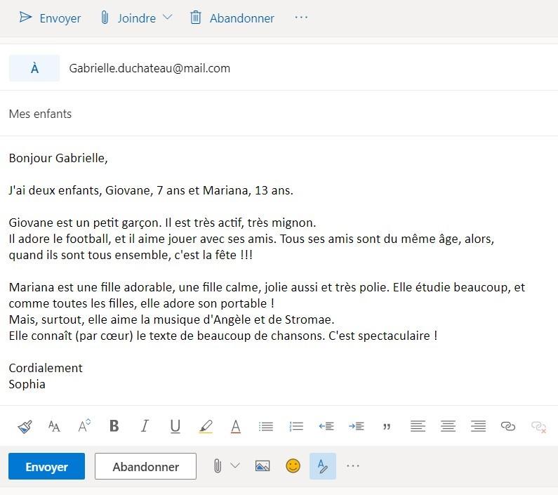 Sophia schrijft een mailtje naar Gabrielle waarin ze vertelt over haar kinderen.
