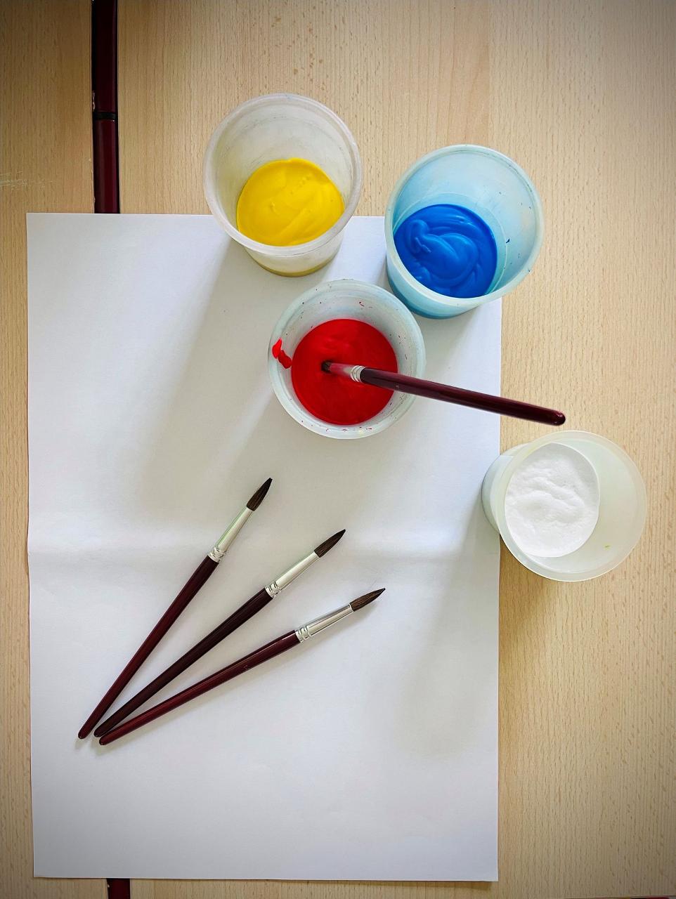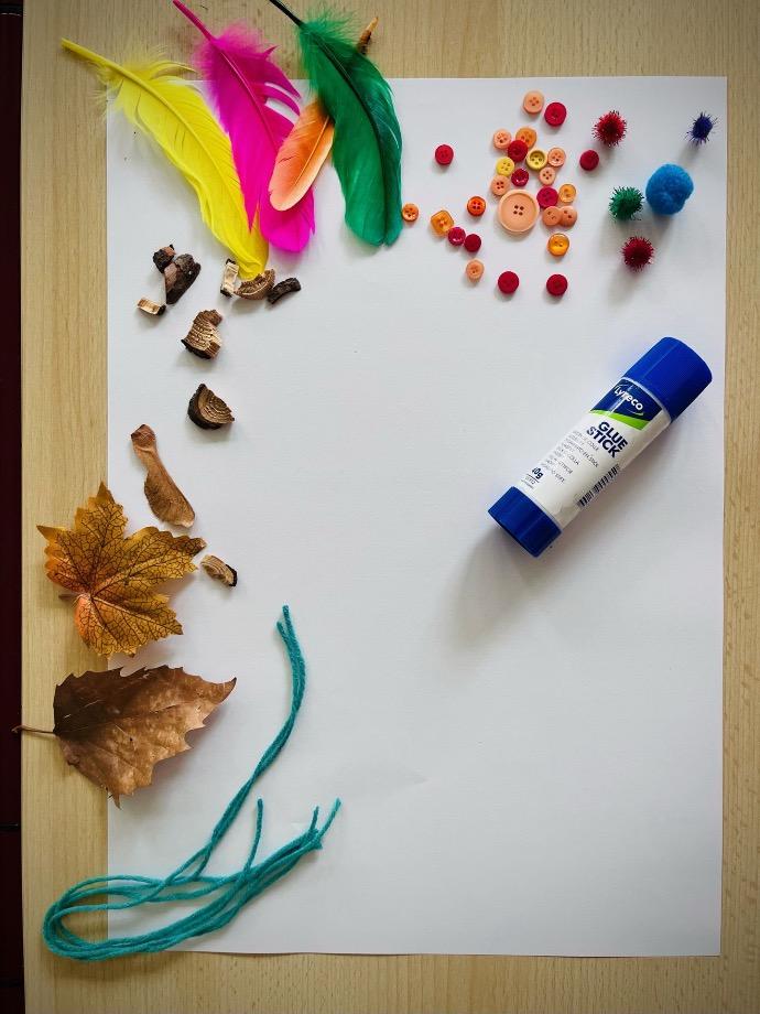 - Je moet ook minstens twee andere materialen dan verf gebruiken. Hiervoor gebruik je wat er vooraan in de klas ligt. Deze maak je vast aan het blad. Je moet uiteraard niet alle materialen gebruiken.